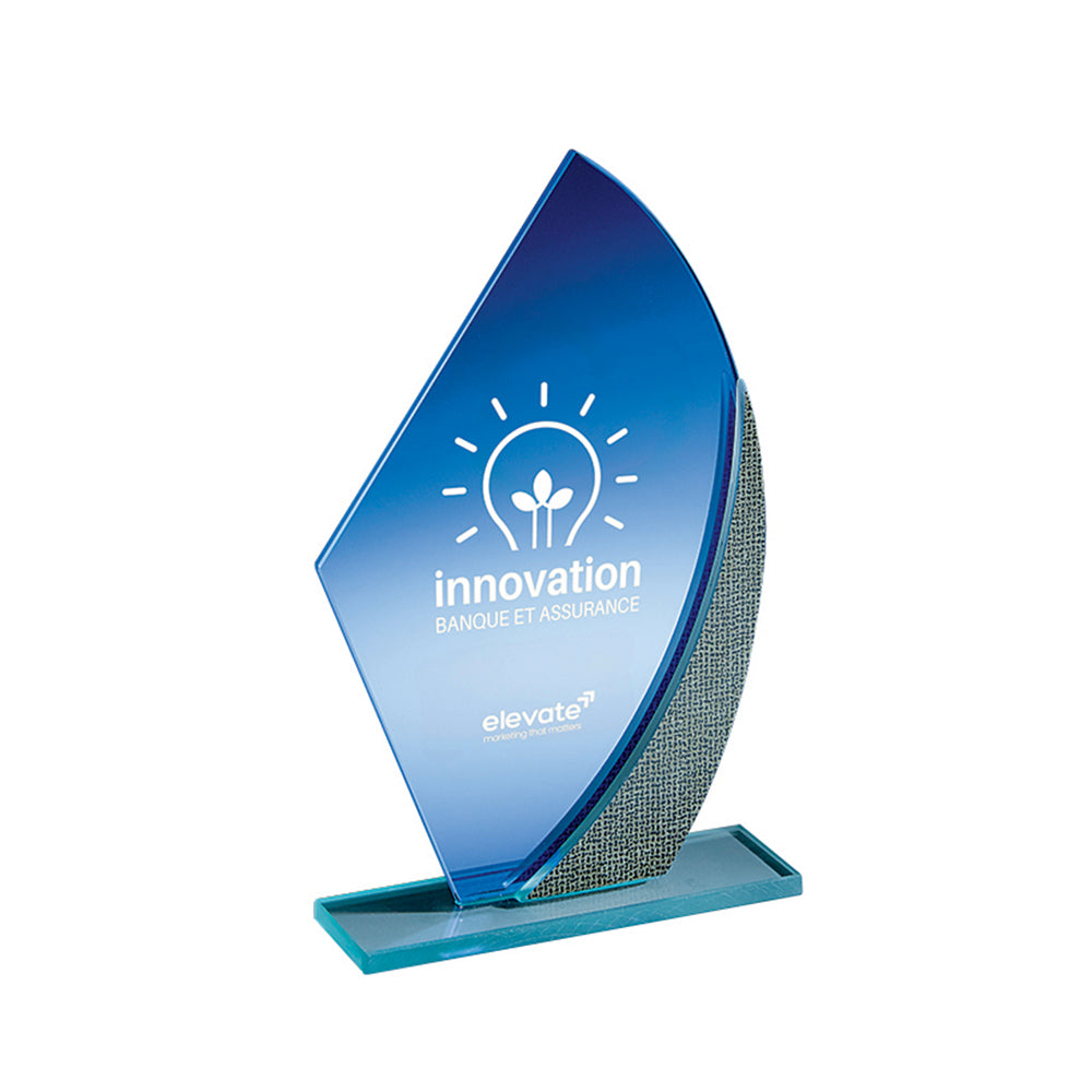 Trophée verre bleu avec effet miroir épaisseur 4 mm - Décor argent - Taille 19 cm